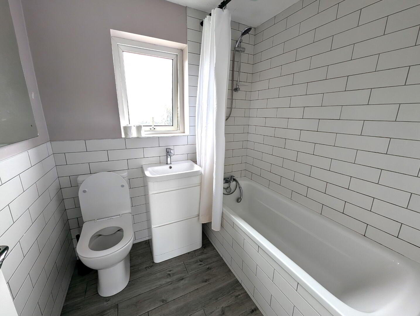 White suite with chrome fittings, shower over bath, extractor fan, tiled walls and floor