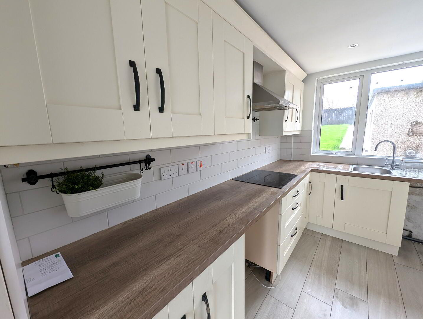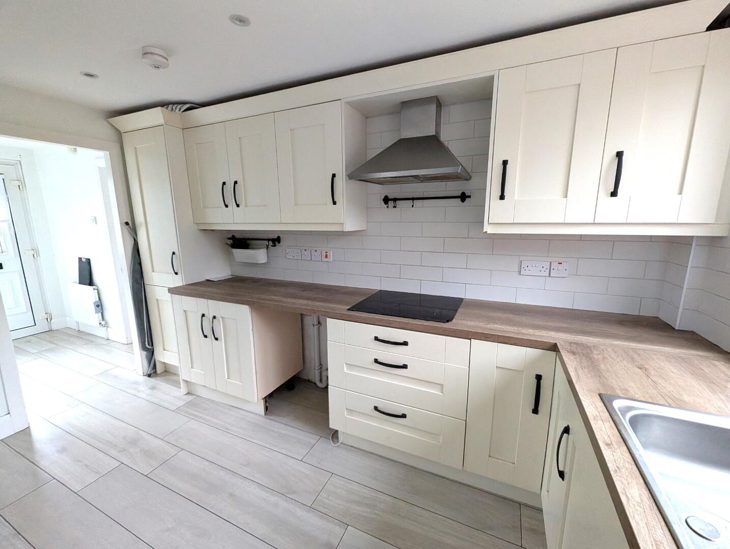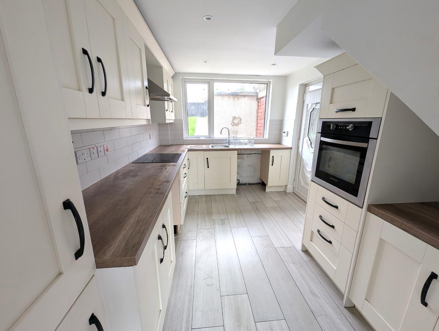 Cream high and low level units, Integrated oven and hob, plumbed for washing machine