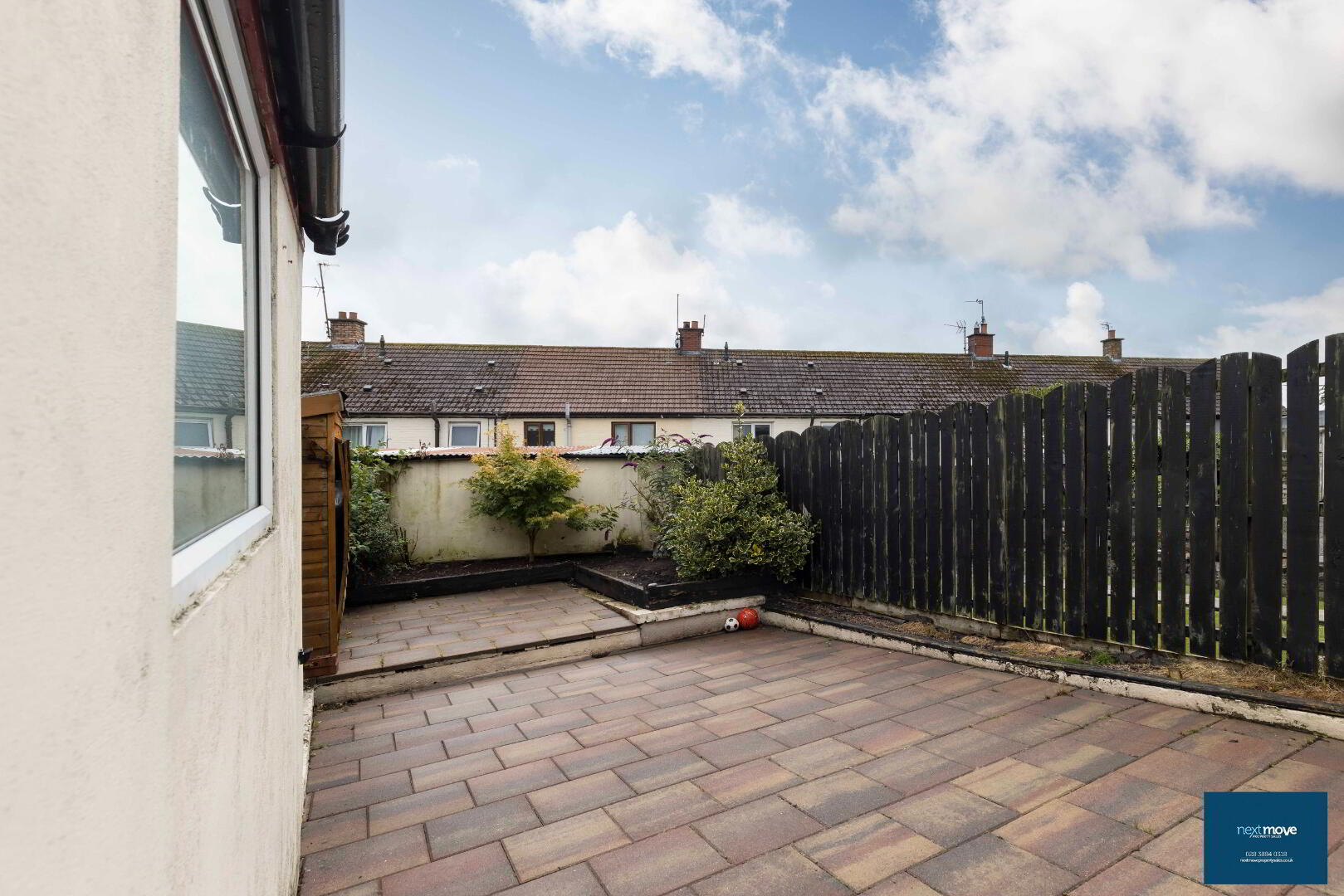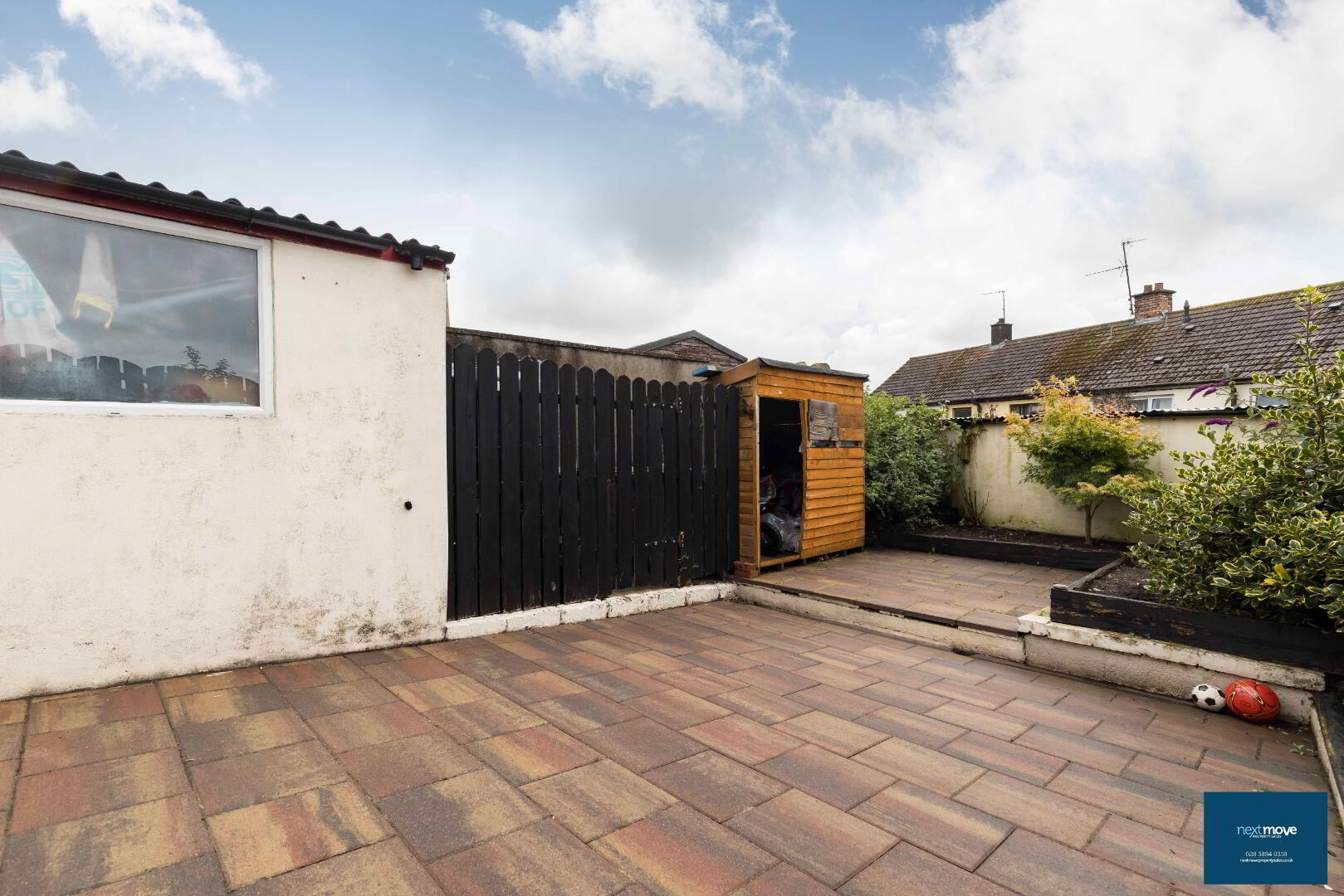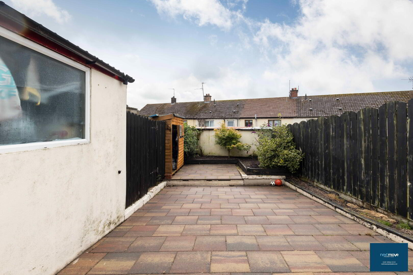 Rear Garden: Block shed, paved, patio area (fenced), flower beds