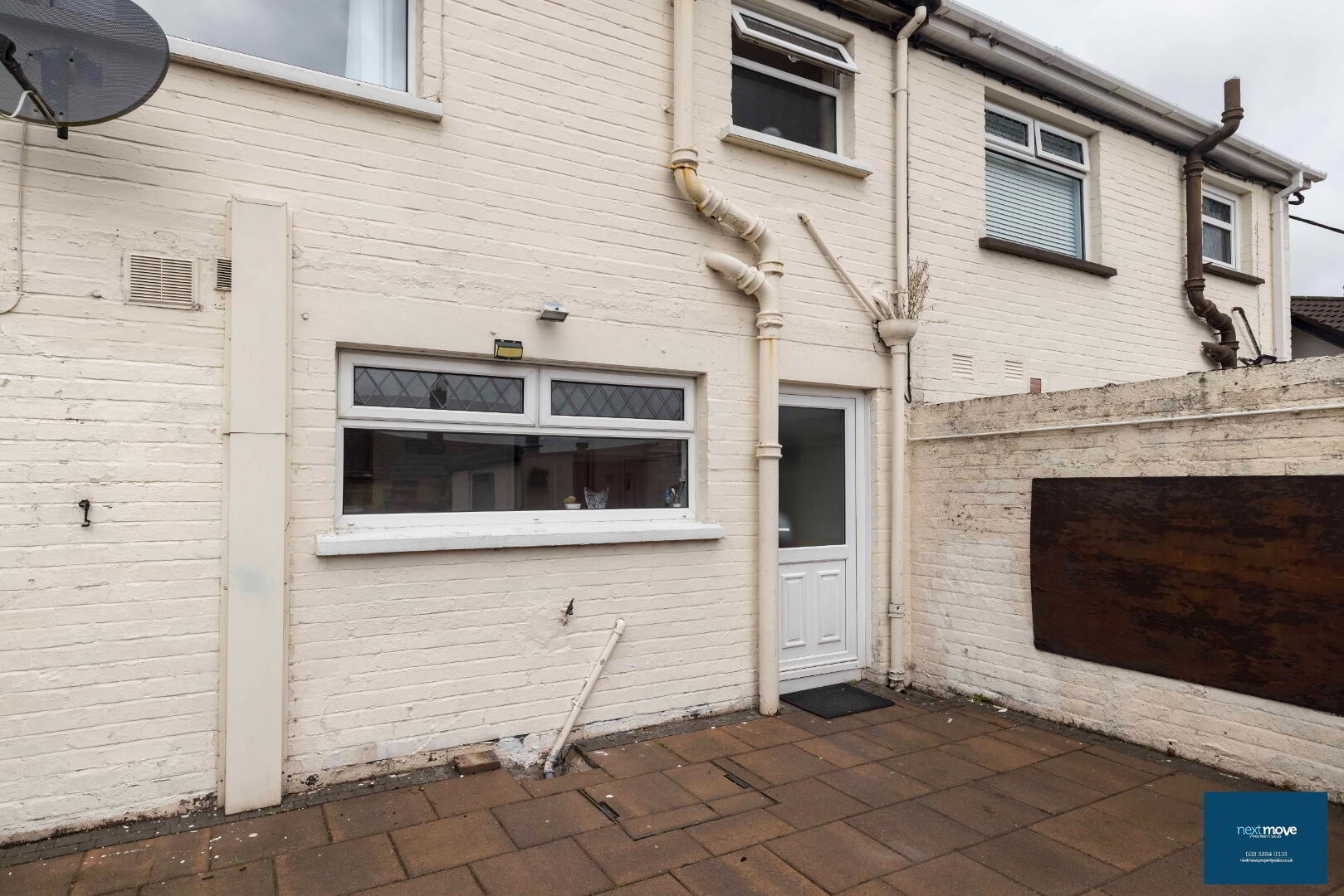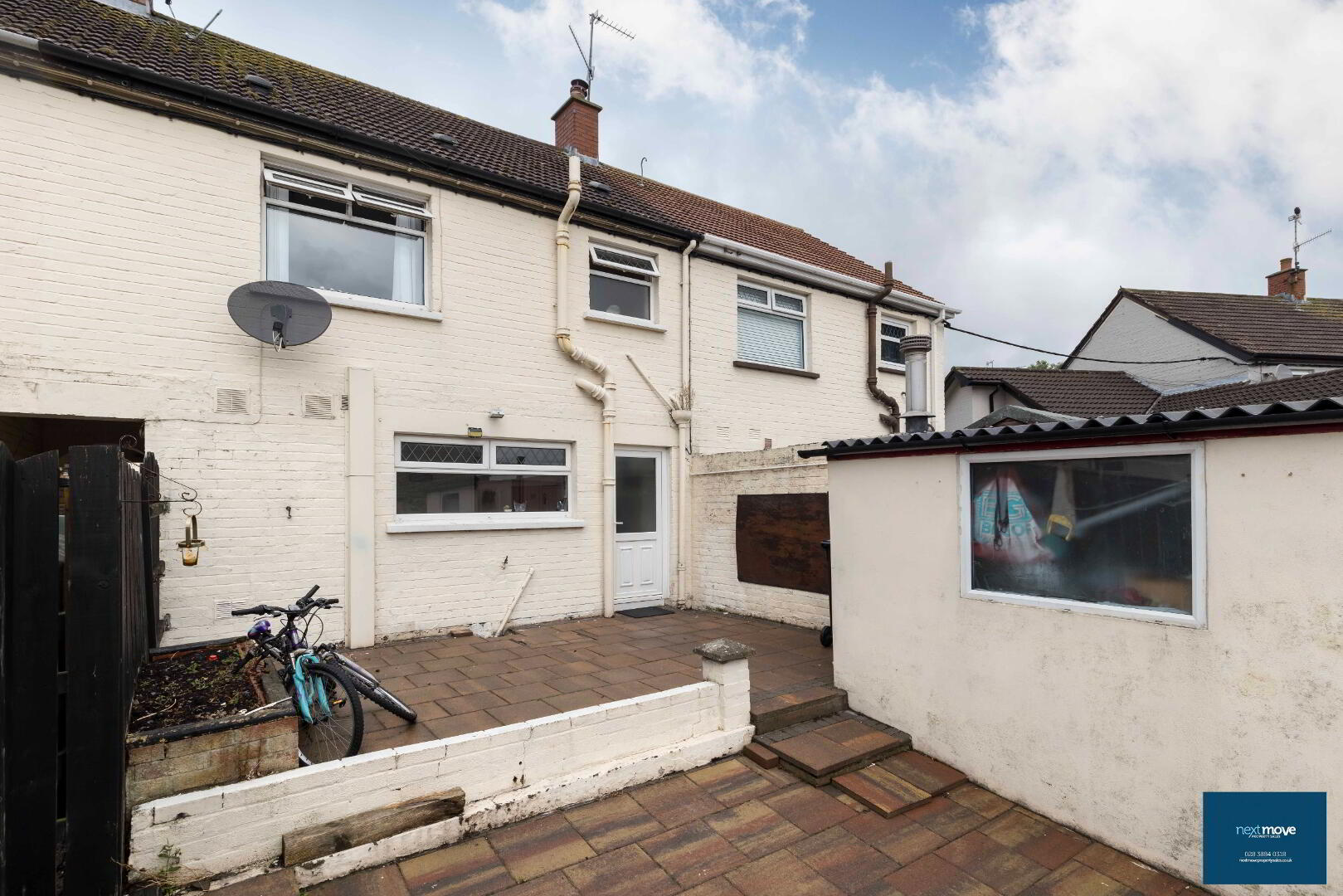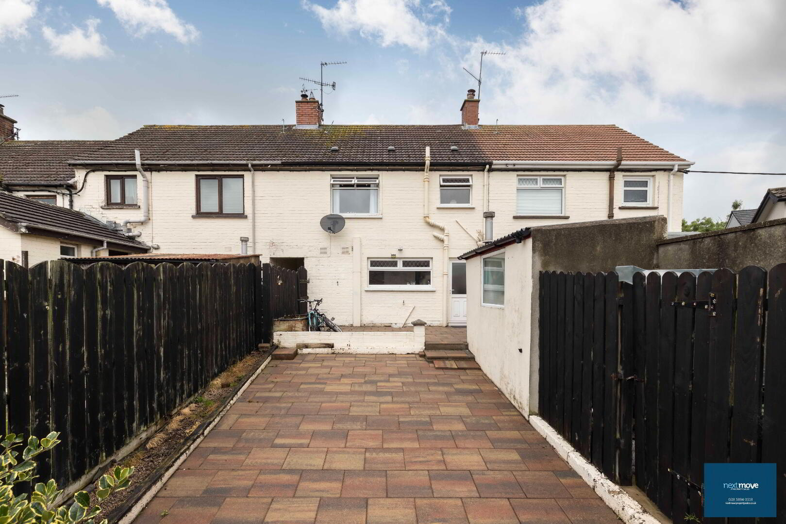 Rear Garden: Block shed, paved, patio area (fenced), flower beds