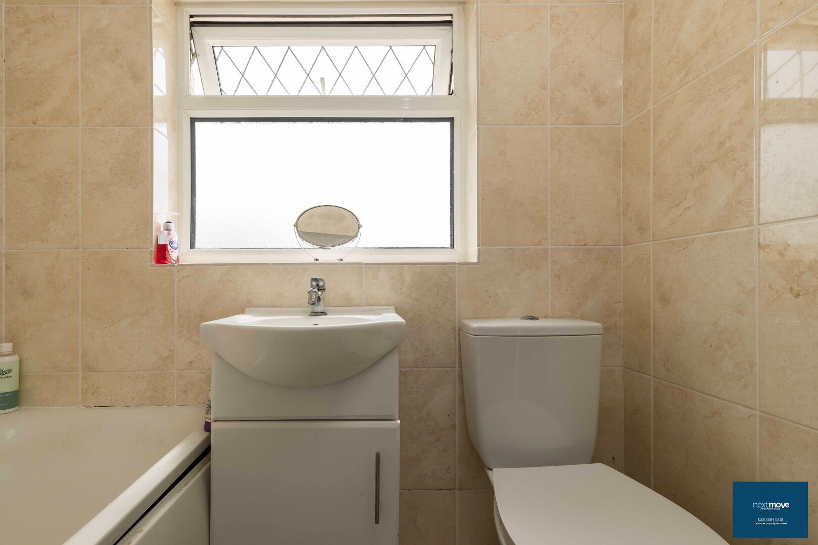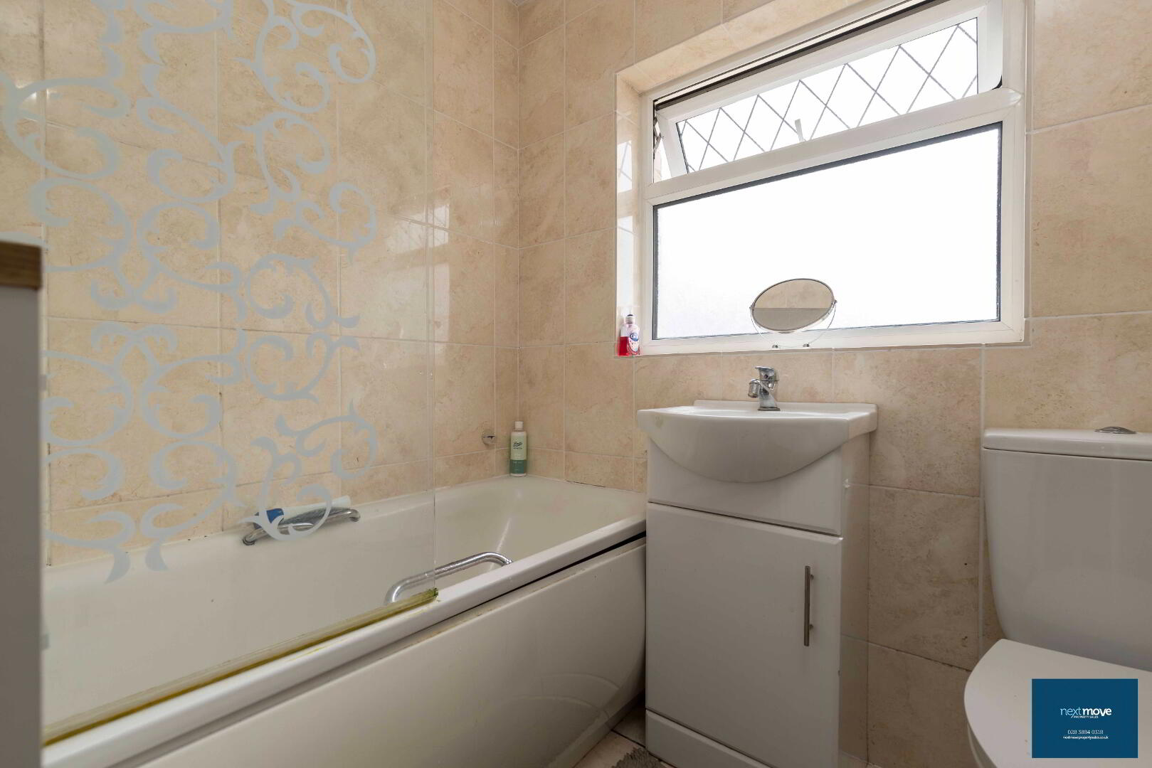 White suite, shower over bath, chrome heated towel rail, tiled floor and walls