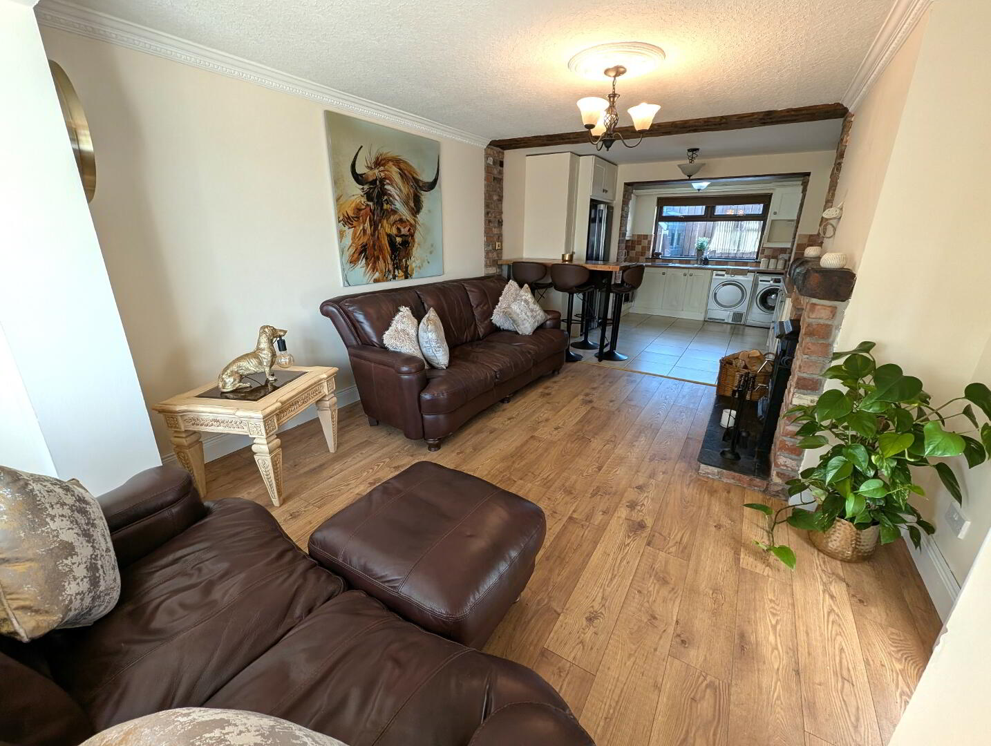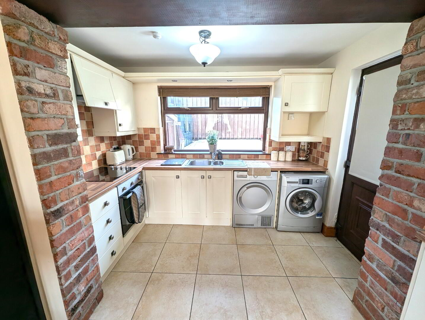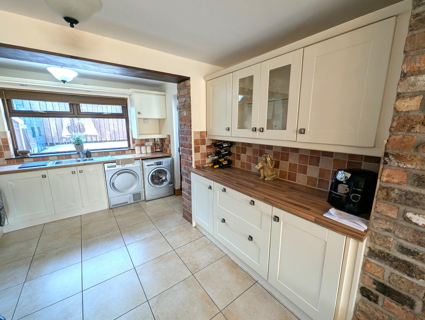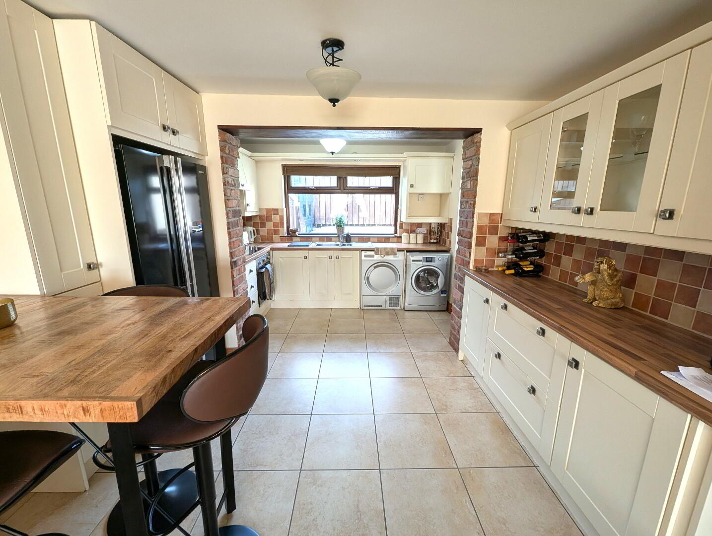 High and low level cream units, washing machine, dryer, fridge/freezer (integrated), table and tall stools, tiled floor