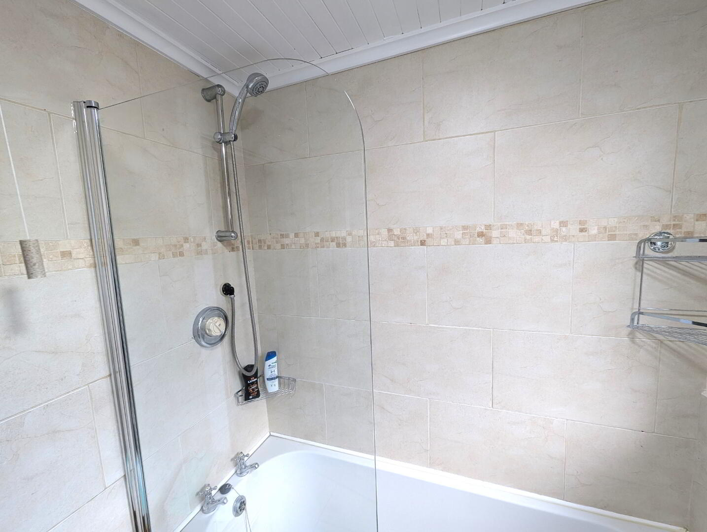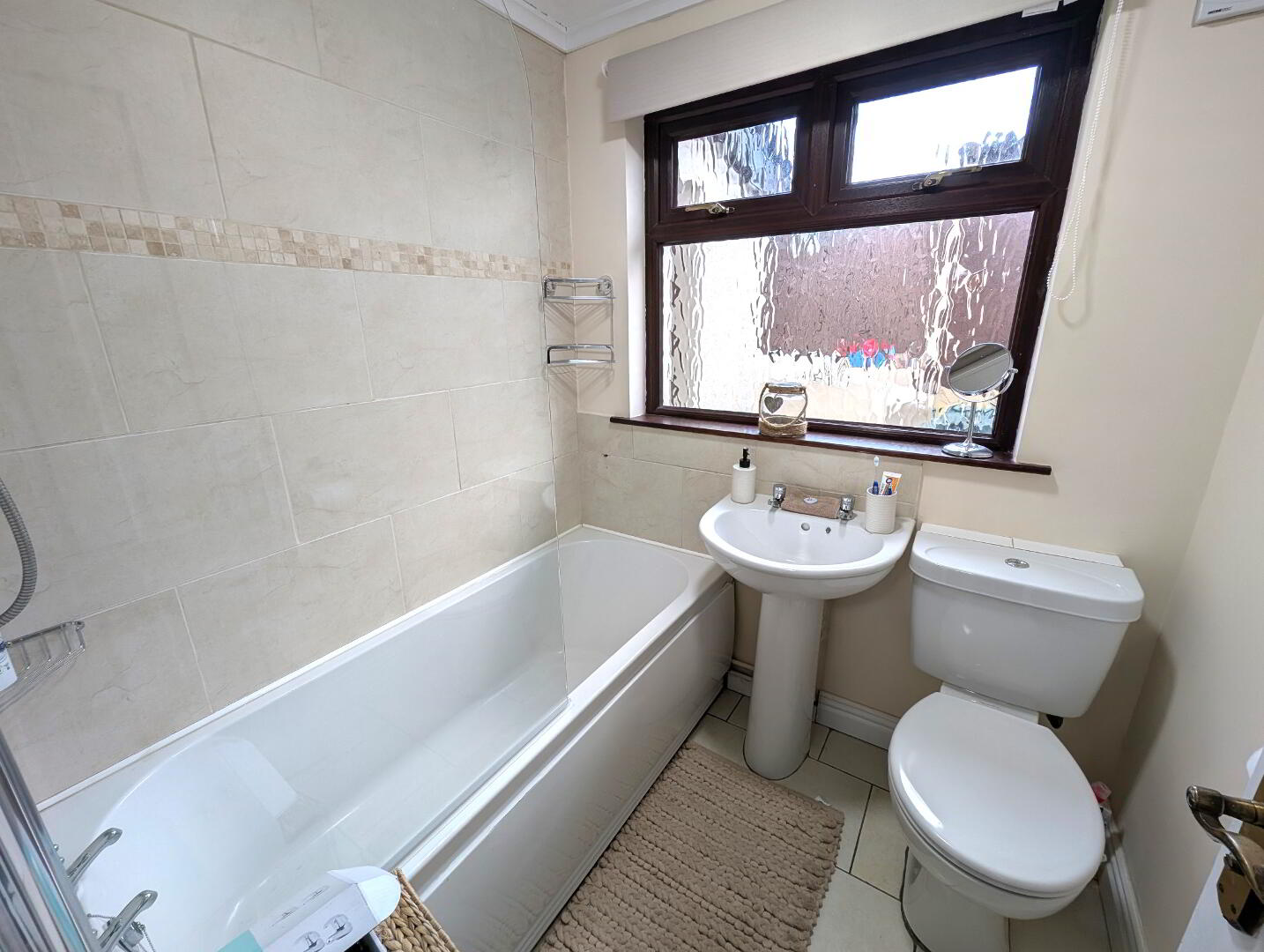 Bathroom: White suite, shower over bath, tiled walls and floor