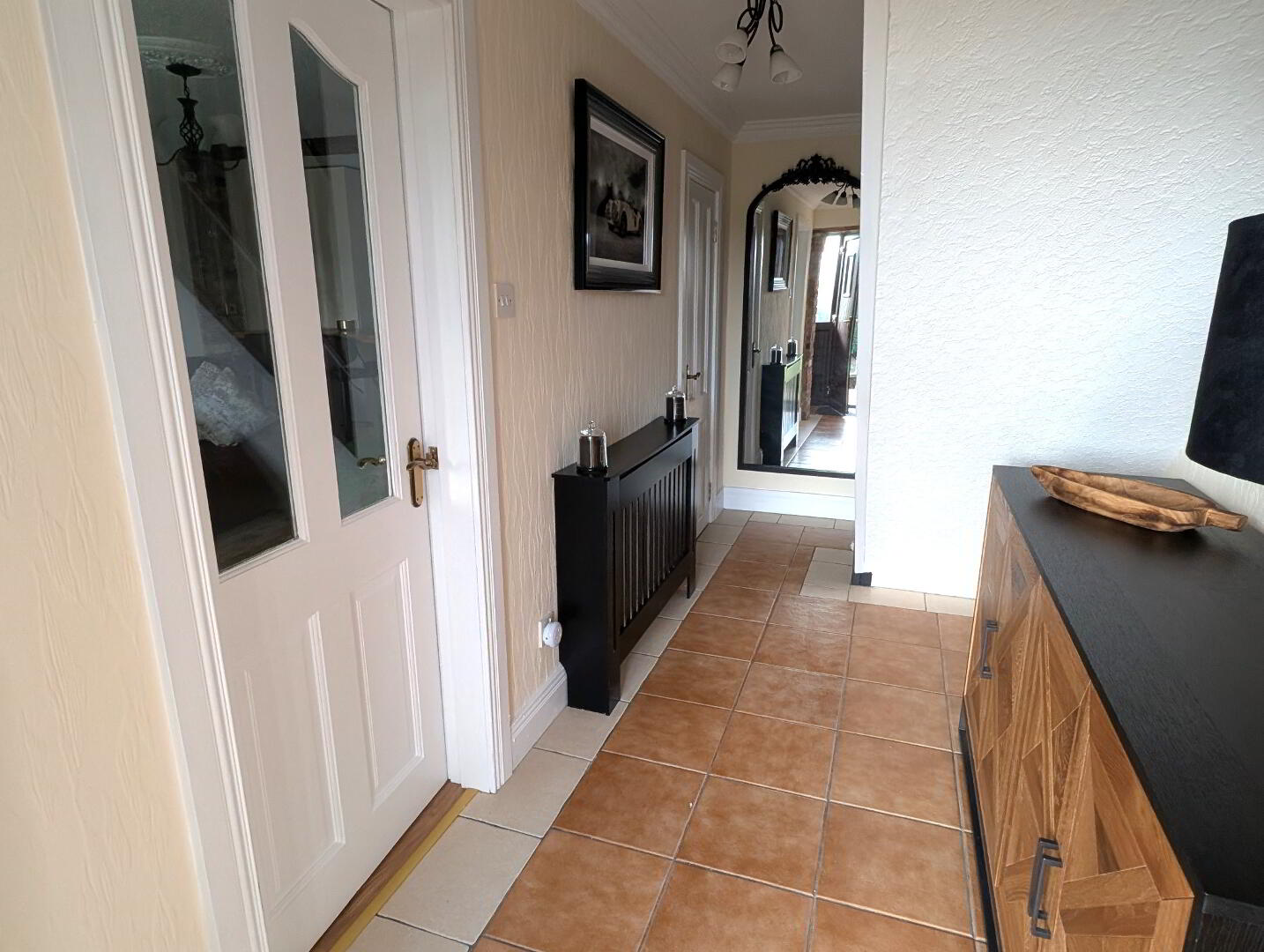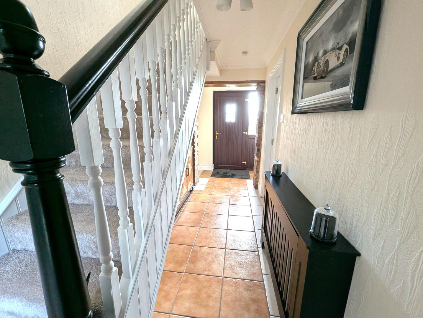 PVC front door, tiled floor, stair carpet