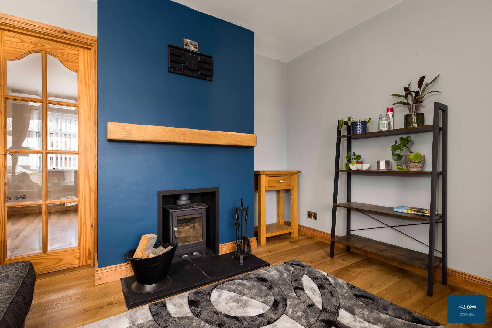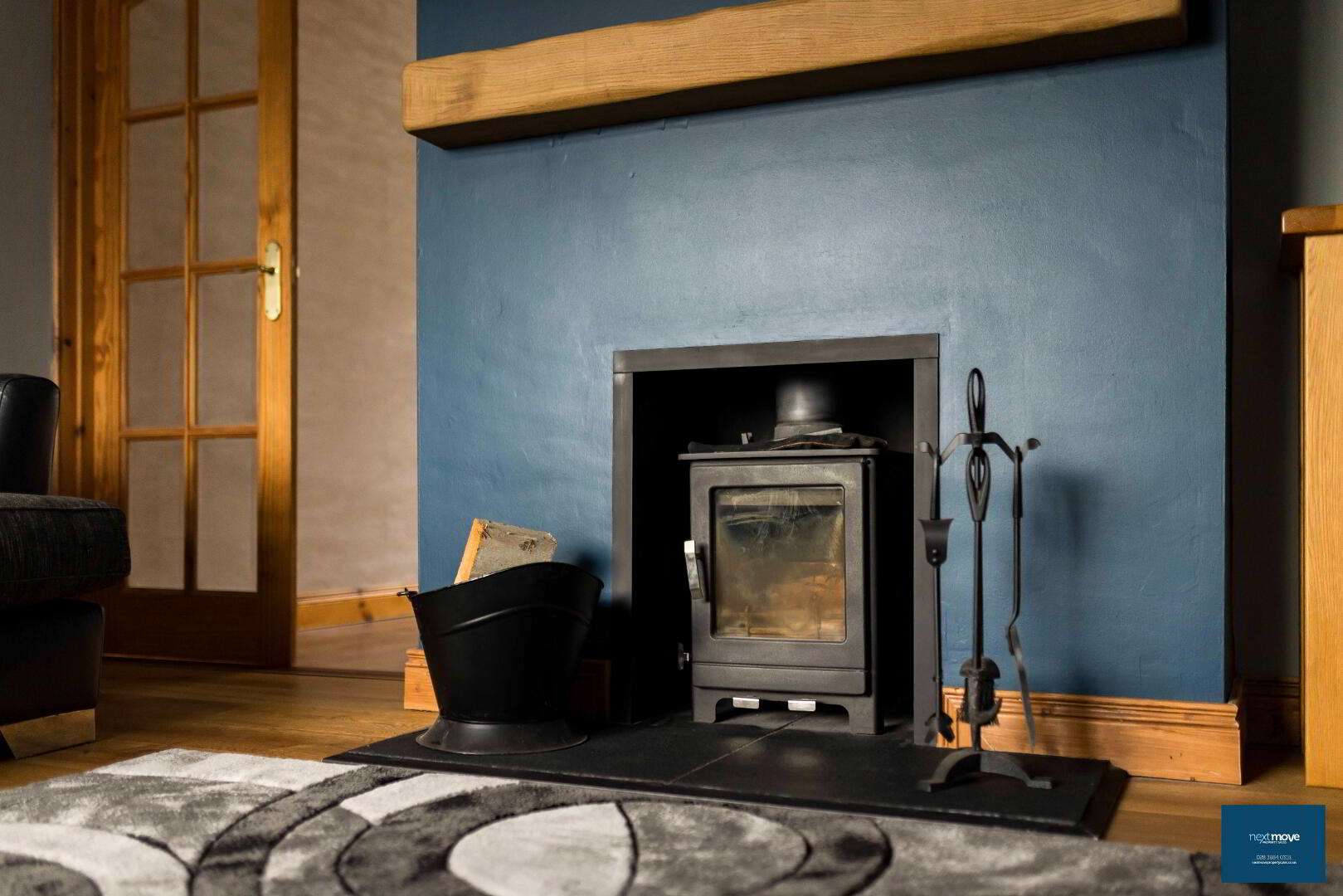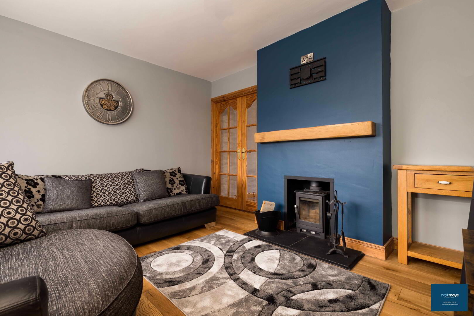 Stove and hearth, solid oak floor, glazed doors leading to dining room, carpet, TV point, power points
