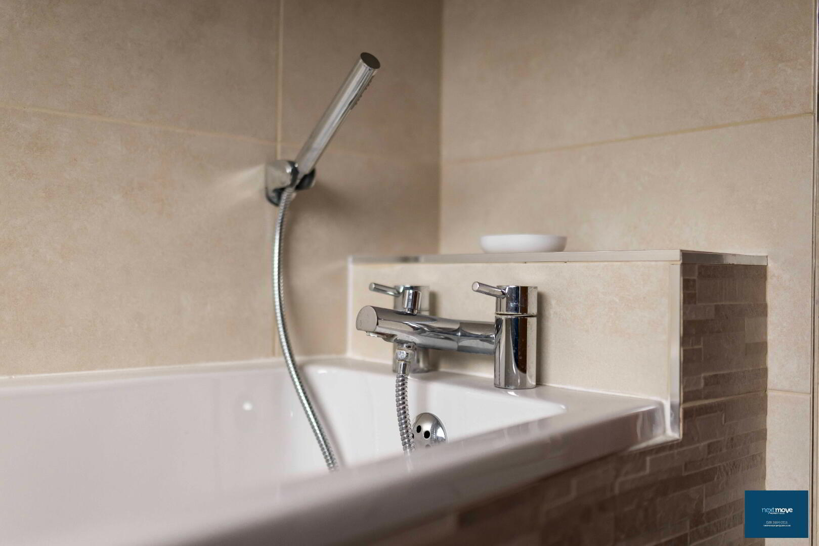White suite with chrome fittings, separate corner shower, bath, tiled walls and floor, spotlights, double radiator